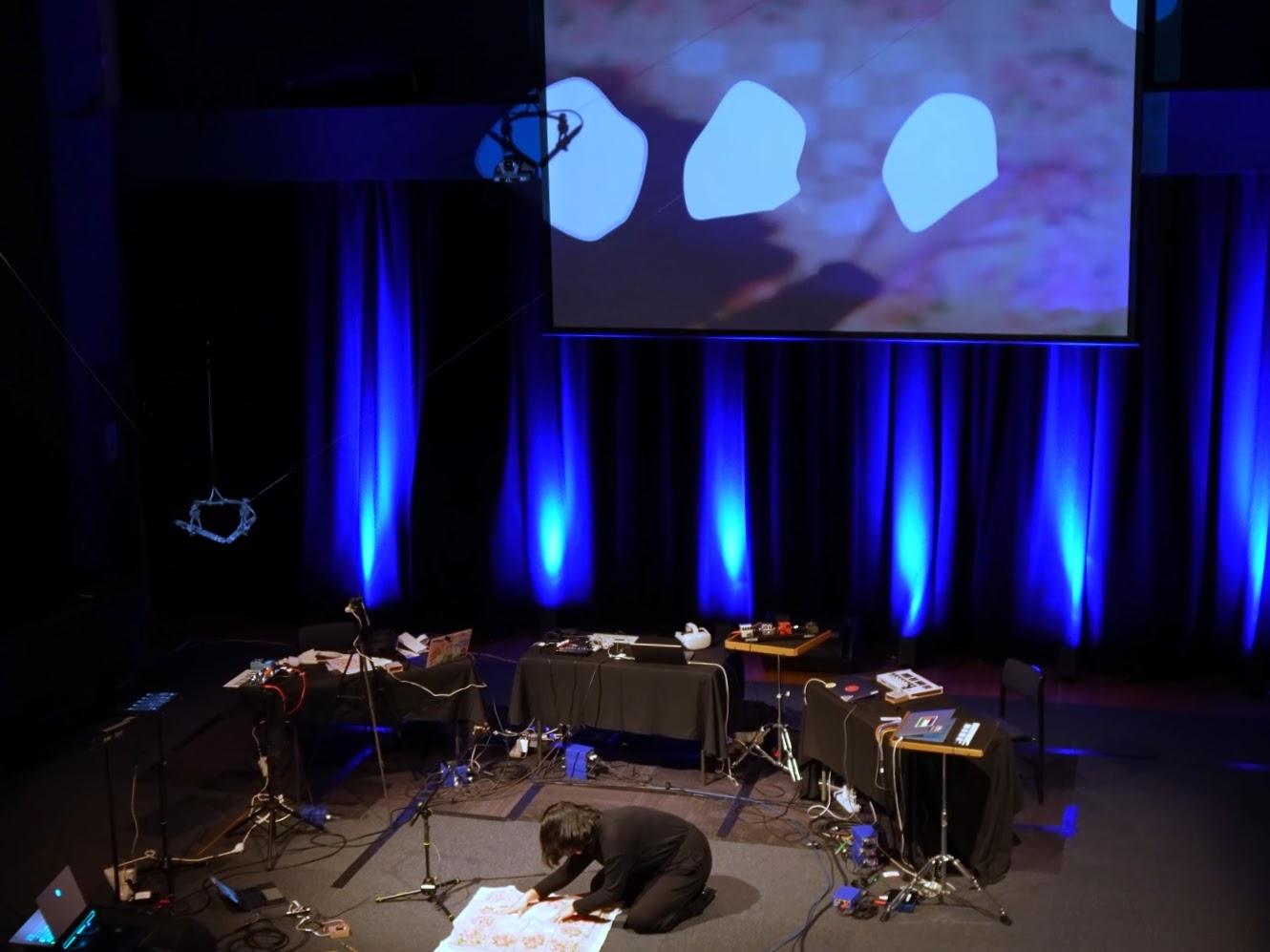 The first iteration of Touching Wires took the form of a musical tablecloth for human performance. It debuted on 29 May, 2024 at Andromeda is Coming and Artificially Intelligent Friends (and human friends) — a 60-minute performance of new music for new AI musical instruments featuring Alec Hunter, Charles Martin, Yichen Wang and Sandy Ma.