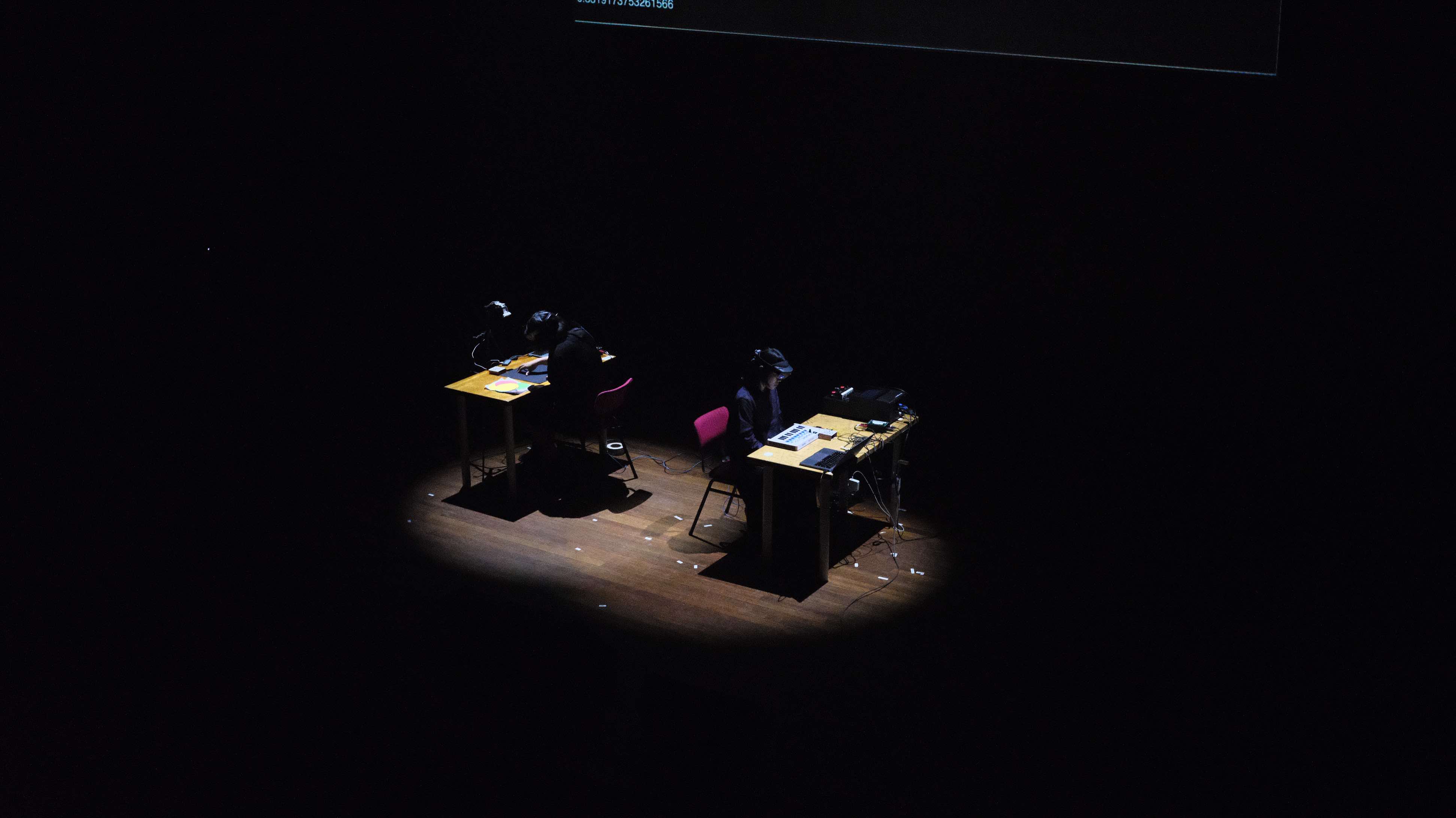 Unspoken is a mixed reality duet performance that explores the aesthetic possibilities of augmented reality technology as a medium for collaborative musical expression. Two performers – Yichen Wang and Sandy Ma – with their tangible musical systems are communicated of each other’s gestural and spatial musical intention through a collaborative augmented reality interface.